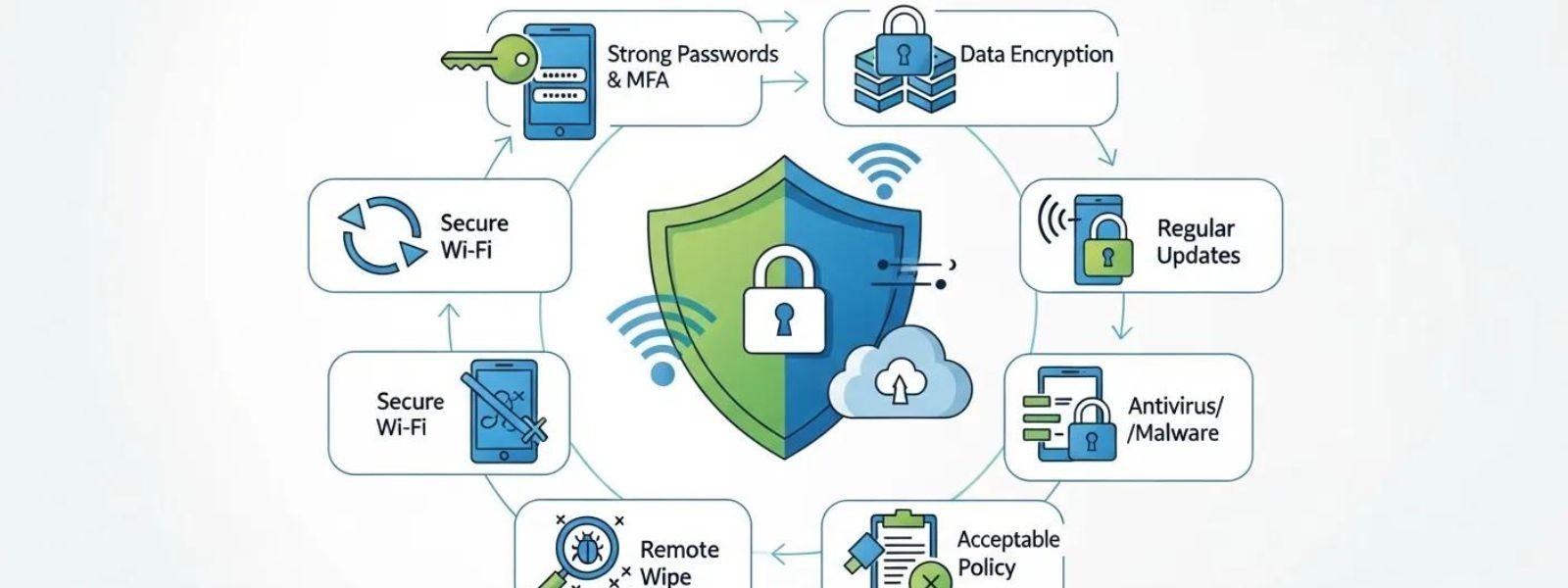 BYOD best practices are the proven security measures that businesses use to protect company data on personal devices. The most important best practices include writing a clear BYOD policy, requiring multi-factor authentication (MFA), enforcing device encryption, using Mobile Device Management (MDM) software, separating personal and work data, training employees on security risks, and having a plan for lost or stolen devices.